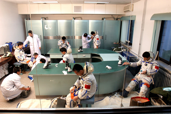 ????2002年6月17日,航天員在進行穿脫訓(xùn)練。新華社發(fā)