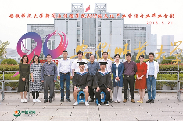 5月21日,安徽師范大學(xué)新聞與傳播學(xué)院組織應(yīng)屆畢業(yè)生拍攝畢業(yè)照,眾多班級的學(xué)生依次排隊拍攝,其中一個班級與眾不同——只有兩名學(xué)生,而與他倆合影的卻有11名老師。并且,11名老師站在后排,兩名學(xué)生坐在前排。當相機的快門摁下之后,這張照片成為該校濃厚尊崇軍人氛圍的亮麗名片。
