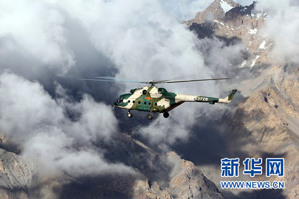 2016年7月20日,新疆軍區(qū)某陸航旅運(yùn)輸直升機(jī)一營飛行員在高海拔邊防線執(zhí)行巡邏任務(wù)。新華社發(fā)(吳世科 攝)