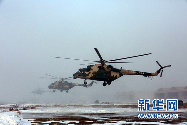 2018年1月5日,新疆軍區(qū)某陸航旅運(yùn)輸直升機(jī)一營在嚴(yán)寒條件下組織飛行訓(xùn)練。 新華社發(fā)(吳世科 攝)
