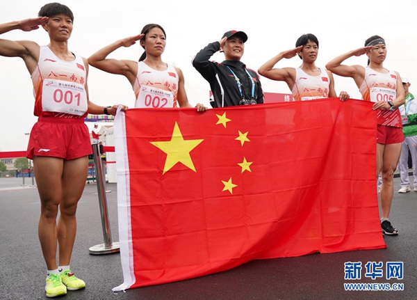 10月23日,中國(guó)隊(duì)成員在女子個(gè)人全能越野跑比賽后手持國(guó)旗敬禮。當(dāng)日,第七屆世界軍人運(yùn)動(dòng)會(huì)女子個(gè)人全能項(xiàng)目比賽在武漢陸軍工程大學(xué)軍械士官學(xué)校結(jié)束,中國(guó)選手盧嬪嬪以5627.2分的總成績(jī)獲得冠軍,隊(duì)友管超楠以5567.6分的總成績(jī)獲得亞軍,王堂林以5506.3分的總成績(jī)獲得季軍,孫洪燕以5474.1的總成績(jī)獲得第四名。新華社記者 王建威 攝