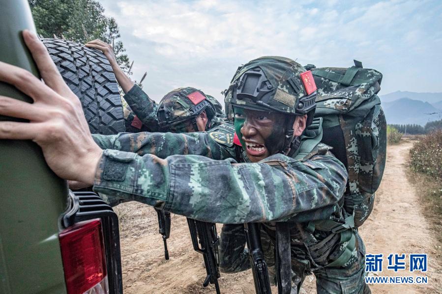 武警廣西總隊(duì)貴港支隊(duì)官兵在野外進(jìn)行坡地推車訓(xùn)練(12月14日攝)。新華社發(fā)(余海洋 攝)