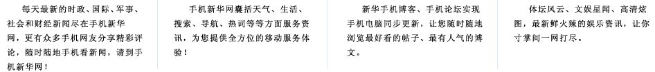 手機新華網(wǎng)是新華網(wǎng)的手機無線門戶網(wǎng)站,是中國最具權(quán)威的免費手機新聞網(wǎng)站之一。歡迎各地電信運營商以及廣告界、企業(yè)界、商務(wù)界、傳媒界等各界人士與我們聯(lián)系,精誠合作,實現(xiàn)共贏。電話:010-63070908,E-mail:xhsjb@xinhuanet.com