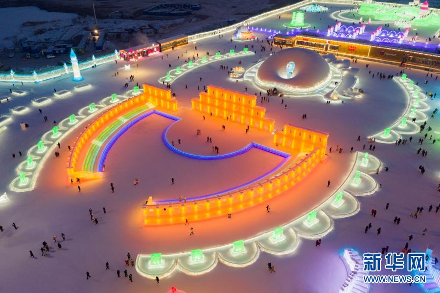 這是2021年1月1日拍攝的哈爾濱冰雪大世界園區(qū)一角(無人機照片)。