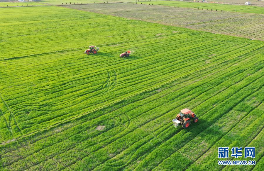 2月23日,湖州錢山下糧油專業(yè)合作社工作人員駕駛農機在田間給小麥施肥(無人機照片)。立春過后氣溫回升,浙江省湖州市吳興區(qū)道場鄉(xiāng)全力開展春耕工作。今年該鄉(xiāng)計劃播種農作物總面積1.2萬畝,其中水稻5000畝、小麥2000畝。新華社記者 翁忻旸 攝
