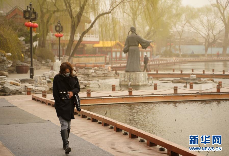 3月15日,市民經(jīng)過北京西海。當(dāng)日,我國北方多地出現(xiàn)沙塵天氣。新華社記者 賈浩成 攝
