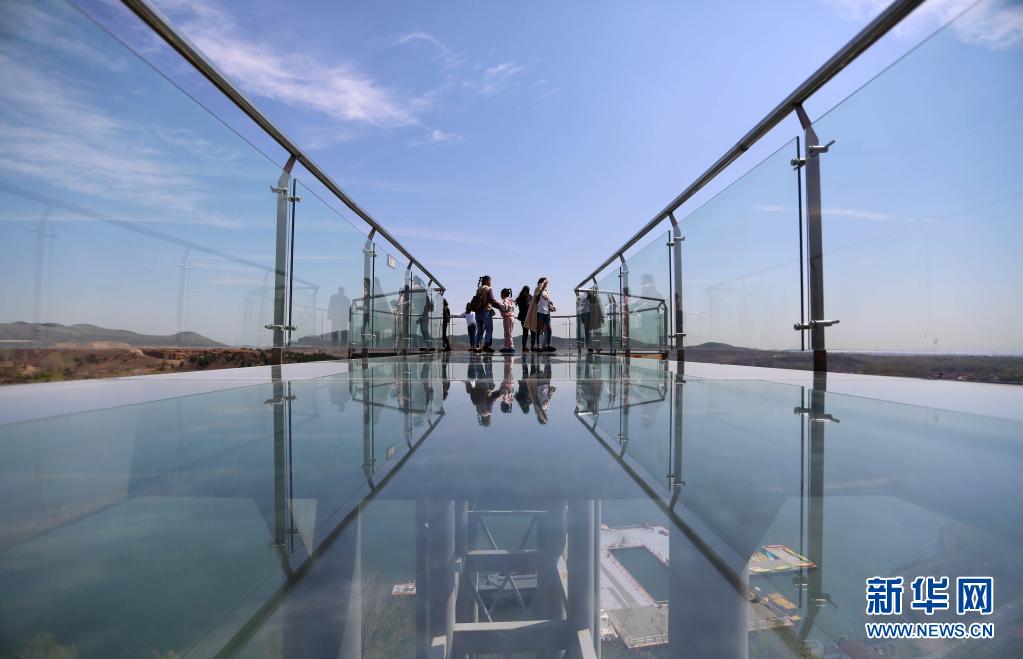 4月5日,游客在山東省臨沂市沂南縣紅石寨景區(qū)內(nèi)體驗(yàn)高空玻璃棧道。