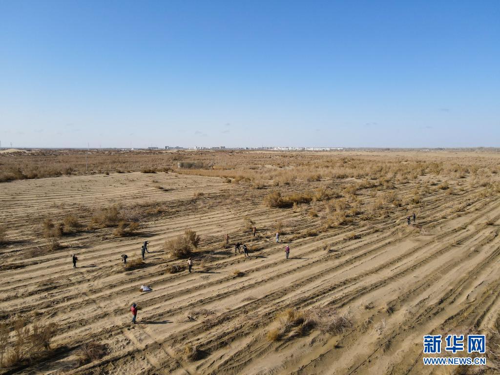 群眾在離且末縣不遠(yuǎn)的沙地里種植梭梭(4月1日攝,無(wú)人機(jī)照片)。新華社記者 高晗 攝