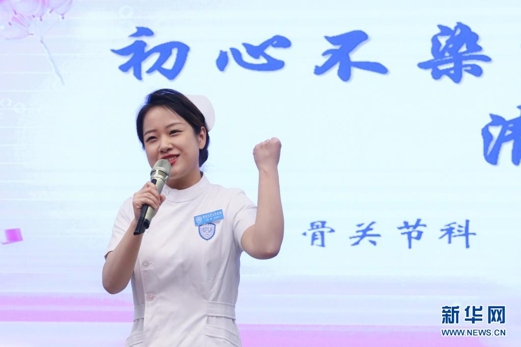 5月10日,北京大學(xué)人民醫(yī)院的一名護(hù)士代表在慶祝活動(dòng)上演講。