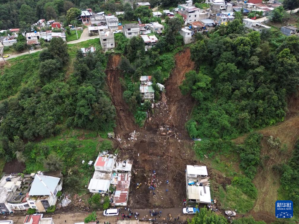 这是10月13日在墨西哥普埃布拉州瓦乌奇南戈市拍摄的降雨引发的山体滑坡现场(无人机照片)。