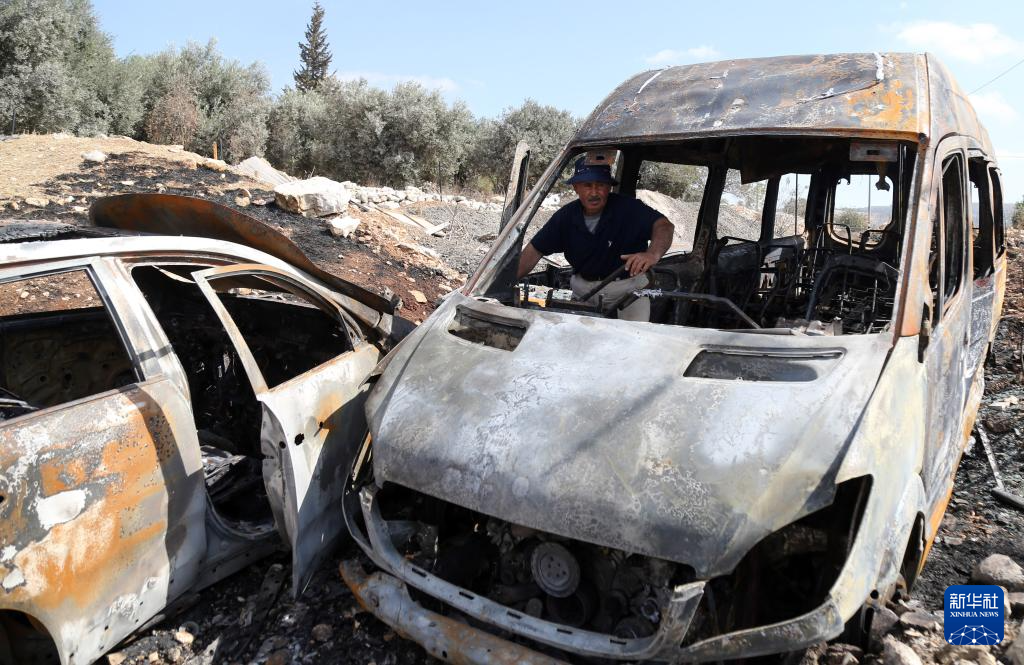10月19日,一名巴勒斯坦男子在约旦河西岸城市伯利恒附近检查被以色列定居者烧毁的车辆。