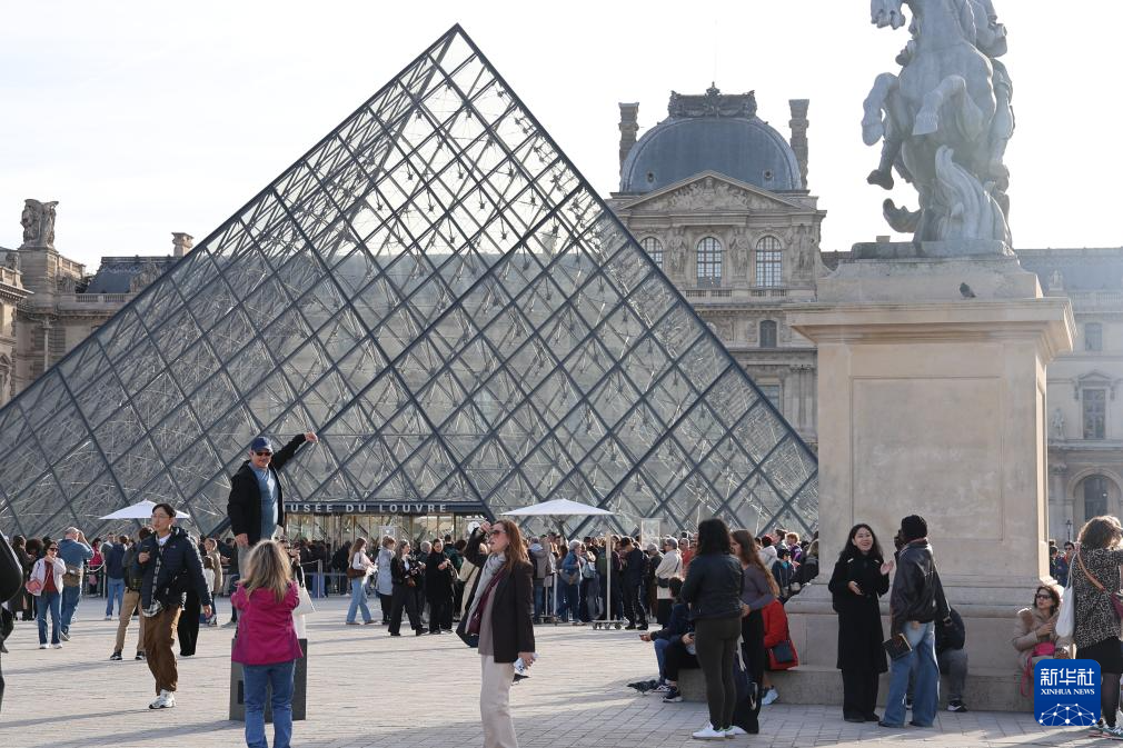 10月22日,在法国巴黎,大量游客聚集在卢浮宫博物馆的玻璃金字塔入口前。