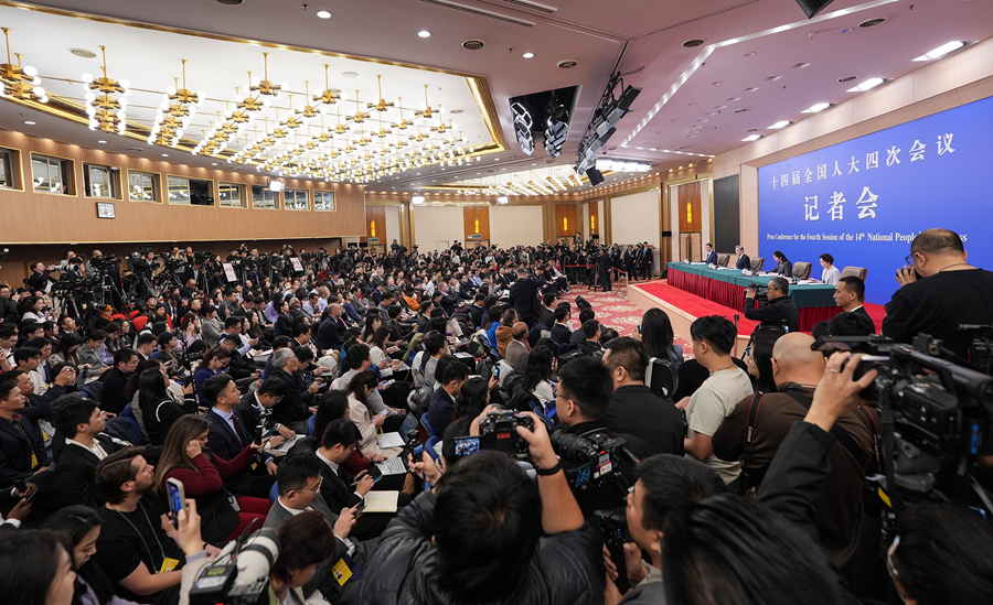 3月8日,十四届全国人大四次会议在北京梅地亚中心新闻发布厅举行记者会。中共中央政治局委员、外交部长王毅就“中国外交政策和对外关系”相关问题回答中外记者提问。这是记者在现场采访。