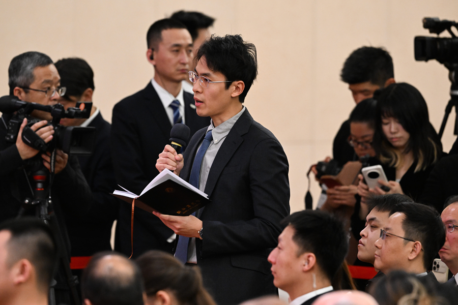 3月8日,十四届全国人大四次会议在北京梅地亚中心新闻发布厅举行记者会。中共中央政治局委员、外交部长王毅就“中国外交政策和对外关系”相关问题回答中外记者提问。这是新华社记者在提问。