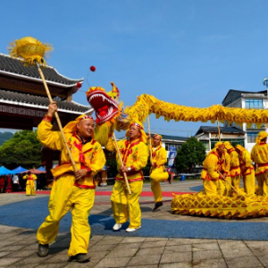 4月19日,在广西柳州市融安县板榄镇欢歌广场举行的“三月三”活动上,民间艺人表演舞龙。