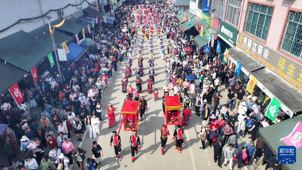 4月19日,在广西柳州市融安县板榄镇,各族群众身着民族盛装参加“三月三”民俗文化巡游(无人机照片)。