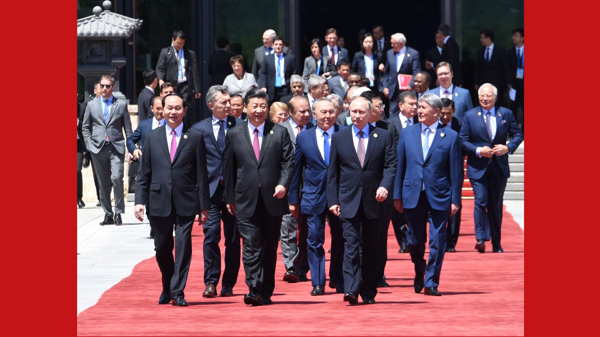 5月15日,“一帶一路”國(guó)際合作高峰論壇圓桌峰會(huì)在北京雁棲湖國(guó)際會(huì)議中心舉行,國(guó)家主席習(xí)近平主持會(huì)議并致開(kāi)幕辭。這是第一階段會(huì)議結(jié)束后,習(xí)近平同外方代表團(tuán)團(tuán)長(zhǎng)及嘉賓步出雁棲湖國(guó)際會(huì)議中心。新華社記者 饒愛(ài)民 攝