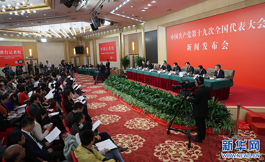 10月26日上午10:00,中國共產(chǎn)黨第十九次全國代表大會新聞發(fā)言人在梅地亞賓館二層新聞發(fā)布廳召開專題新聞發(fā)布會,請有關方面負責人解讀十九大報告,并回答記者關心的問題。圖為新聞發(fā)布會現(xiàn)場。新華網(wǎng) 翟子赫 攝