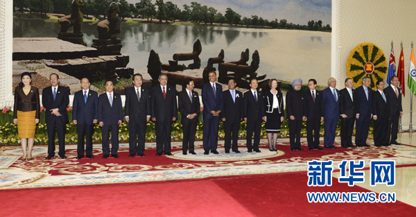 ??? 11月20日,第七屆東亞峰會在柬埔寨金邊舉行。中國國務(wù)院總理溫家寶與東亞峰會其他成員國領(lǐng)導人共同出席。這是與會領(lǐng)導人在會前合影。新華社記者 張鐸 攝
