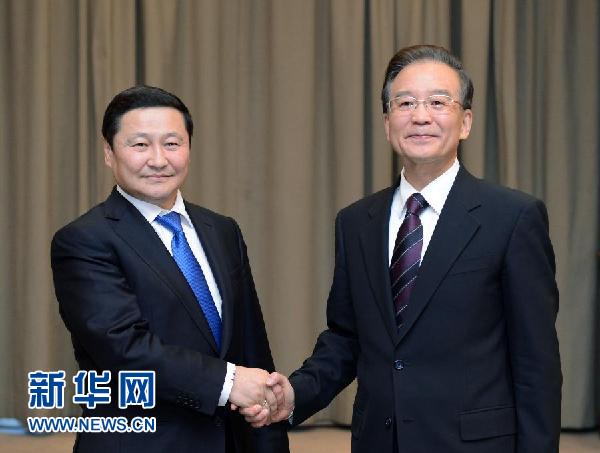 ??? 12月5日,國(guó)務(wù)院總理溫家寶在比什凱克會(huì)見(jiàn)蒙古國(guó)總理阿勒坦呼亞格。 新華社記者謝環(huán)馳攝