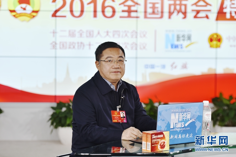 2016年3月12日,全國人大代表、正邦集團董事局主席、總裁林印孫做客新華網(wǎng)兩會訪談直播間。圖為林印孫在訪談現(xiàn)場。新華網(wǎng) 郭小天 攝