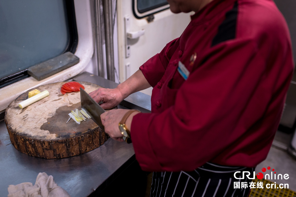 列車上的廚師和一般的餐廳廚師最大的區(qū)別在于“晃”,火車在運行中顛簸不斷,“最重要的是腿要分開,站成外八字,扎好馬步,隨著車廂晃動的方向,這樣才能穩(wěn)當。”白師傅說。