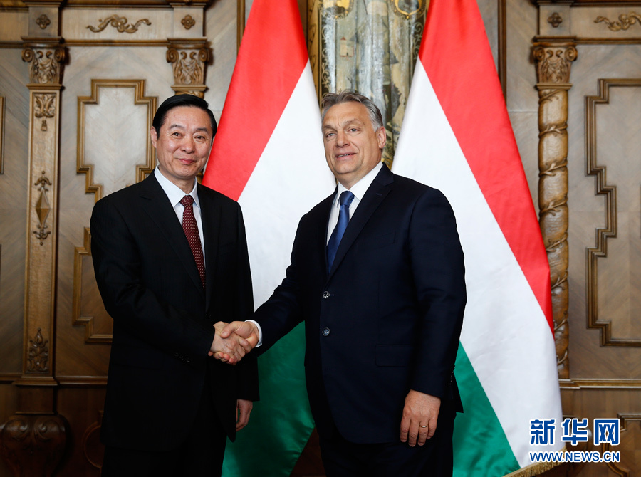 4月24日,在匈牙利首都布達(dá)佩斯,匈牙利總理、青民盟主席歐爾班(右)會見中共中央政治局委員、中央書記處書記、中宣部部長劉奇葆。新華社記者葉平凡攝
