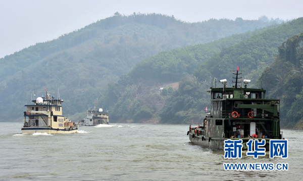 中老緬泰聯(lián)合巡邏執(zhí)法船在瀾滄江-湄公河上的云南西雙版納關(guān)累港的江面上行駛(2015年3月17日攝)。新華社記者 陳海寧 攝