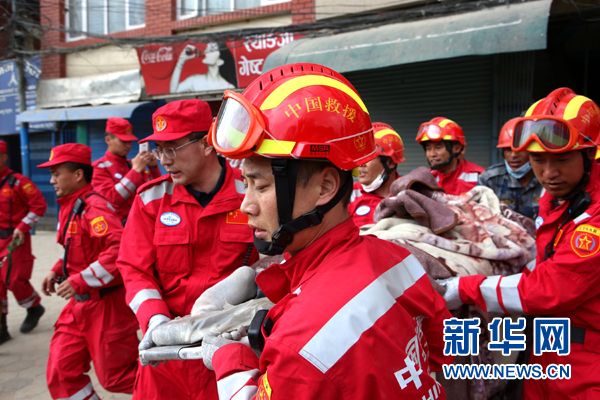 在尼泊爾首都加德滿都,中國國際救援隊(duì)搜救隊(duì)員從因地震坍塌的樓房中抬出一名幸存者(2015年4月26日攝)。新華社記者 白陽 攝