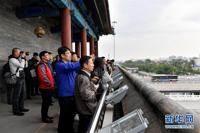10月12日,記者團(tuán)在北京永定門(mén)城樓上參觀(guān)。新華社記者 李鑫 攝