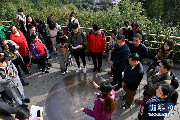 10月12日,記者團(tuán)在景山公園北京城中心點(diǎn)參觀(guān)。新華社記者 李鑫 攝