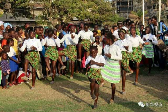 2016年4月30日,岡比亞學(xué)生團(tuán)體在首都班珠爾建城200周年慶?;顒又斜硌菸璧?。新華社記者 王猛攝