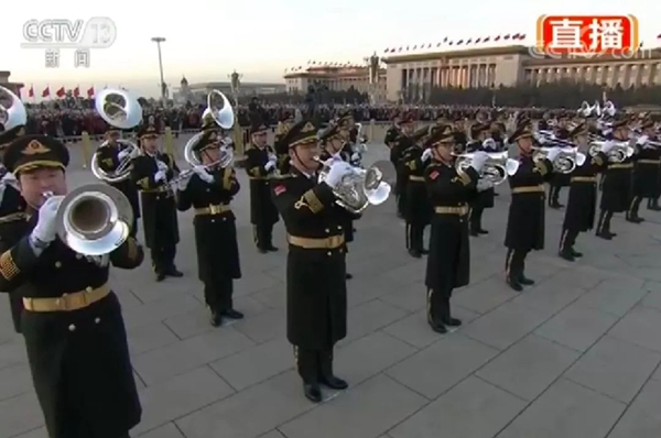 8名禮號手在天安門城樓吹響升旗號角,升國旗儀式正式開始。2018-01-01 07:26:05