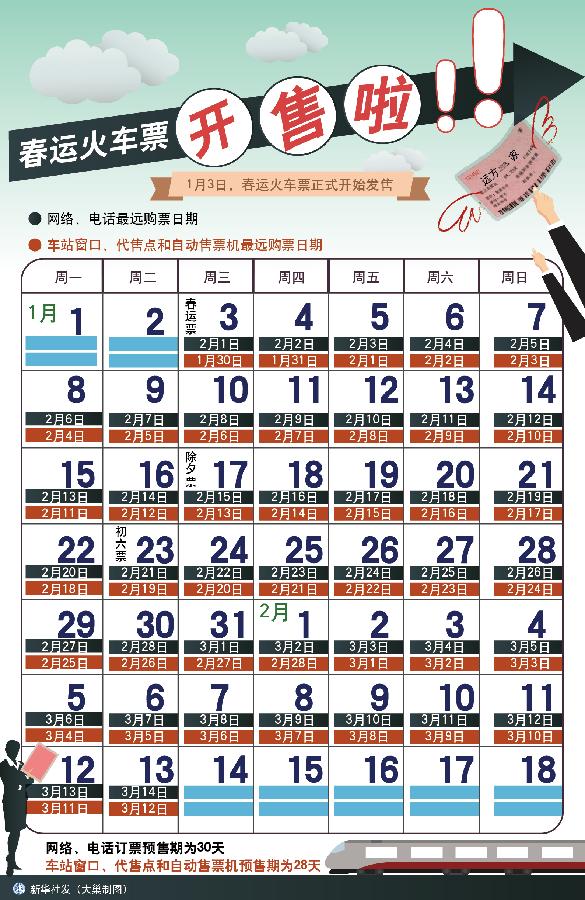 新華網(wǎng)北京1月21日電(韓家慧)初五初六返程火車票將在22、23日通過網(wǎng)絡和電話開售。與此同時,除夕前幾天的熱門車票也將在26日左右迎來退票高峰。