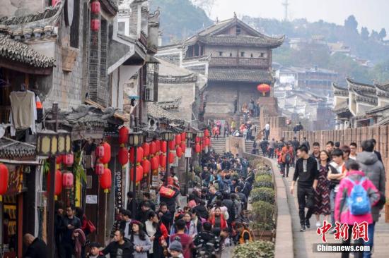2月17日,正值農(nóng)歷大年初二,湖南鳳凰古城內(nèi)人頭攢動(dòng),眾多海內(nèi)外游客選擇來(lái)到鳳凰古城感受新春年味。 楊華峰 攝