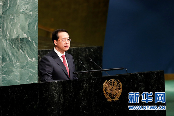 3月23日,在位于紐約的聯(lián)合國總部,中國常駐聯(lián)合國代表馬朝旭在聯(lián)合國大會“國際水行動十年”計劃高級別活動上發(fā)言,闡述中國水策略。新華社記者 李木子 攝