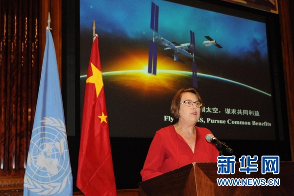 5月28日,在奧地利首都維也納,聯(lián)合國(guó)外層空間事務(wù)辦公室主任西莫內(nèi)塔·迪皮波在公告發(fā)布儀式上講話。新華社記者劉向攝