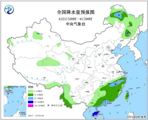 6月3日08時(shí)至4日08時(shí),新疆中北部、青藏高原中東部、甘肅南部、西南地區(qū)大部、江南中南部、華南大部等地有小到中雨,西南地區(qū)東部和南部、華南北部和中部等地的局地有大雨或暴雨(100~120毫米),上述局部地區(qū)將伴有短時(shí)強(qiáng)降水等強(qiáng)對(duì)流天氣。新疆北部、內(nèi)蒙古東部、華北西部等地的部分地區(qū)有4~6級(jí)風(fēng),其中北疆山口地區(qū)陣風(fēng)可達(dá)9~10級(jí)。南海中南部等地將有6-8級(jí)大風(fēng),陣風(fēng)9級(jí)。