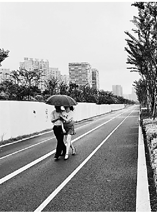 雨中的“最美跑道”依然很美,但跑道之外可就不那么“美”了。記者穿過跑道外側(cè)綠化帶時經(jīng)過聞濤路上的一個停車場,這里地勢高于聞濤路卻滿是積水,一不小心就踩到坑里。停車場外的人行道上也布滿水坑,雖然積水不深,走上一圈,運動鞋濕透。經(jīng)過這里的路人不約而同地繞開人行道而走大馬路。