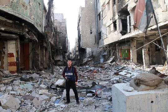 圖為陳聰在敘利亞戰(zhàn)場(chǎng)前線(xiàn)采訪(fǎng)。