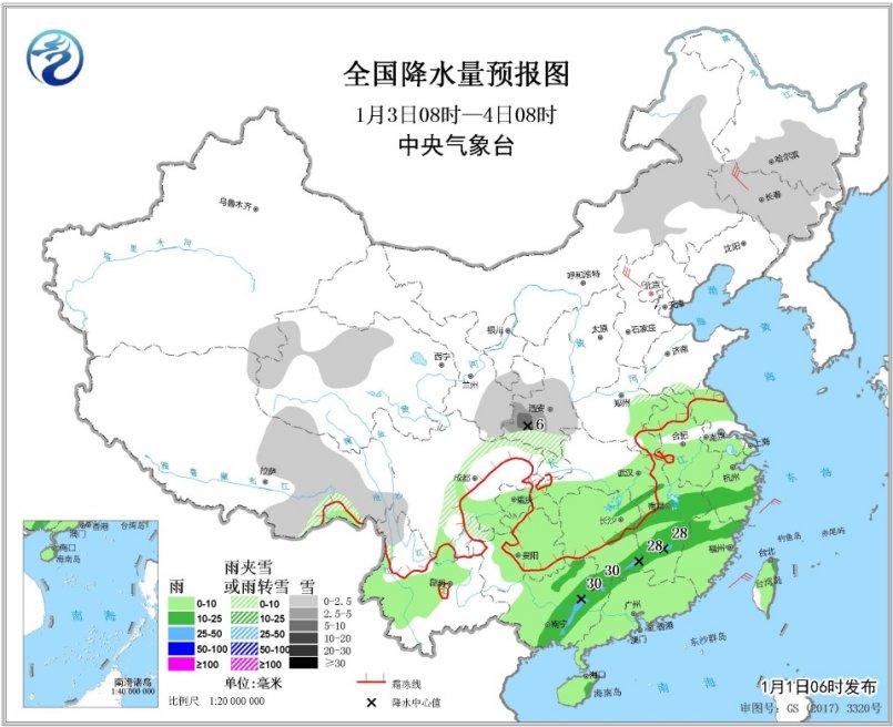 受低層切變系統(tǒng)影響,未來三天江南華南多陰雨雪天氣,其中,1月1~2日江南、華南等地有小雨雪,貴州中部、湖南中南部、江西西部和北部等地有小雪或雨夾雪,局地有凍雨,云南中南部、華南等地部分地區(qū)有小到中雨,1月3日起,我國中東部地區(qū)自西向東將有一次較明顯降水過程。