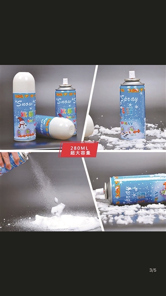 這種“雪花噴霧”外觀類似罐裝的小瓶殺蟲劑噴霧,搖晃后按壓,即可噴出類似雪花的白色泡沫狀物質(zhì),落在衣服上或物品上,一段時(shí)間后會(huì)化成水狀。