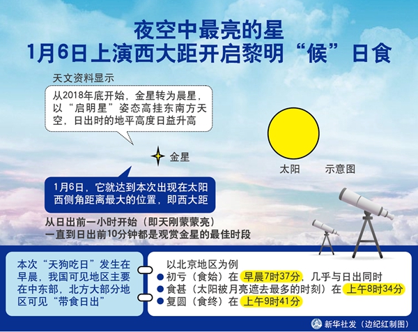 新華社天津1月4日電(記者周潤(rùn)?。?duì)于天文愛好者來說,本月6日注定會(huì)是一個(gè)忙碌的早晨,看完西大距的金星,就可以繼續(xù)欣賞一次精彩的日偏食。