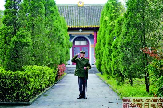 3月27日,程樟柱在紀(jì)念館內(nèi)向前來(lái)參觀的游客行軍禮。