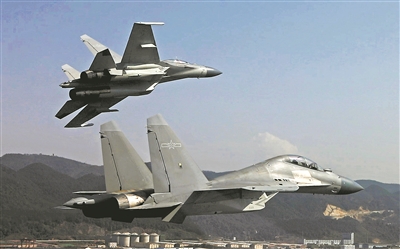 西部戰(zhàn)區(qū)空軍航空兵某旅殲-16戰(zhàn)機(jī)低空訓(xùn)練。(特約記者 劉應(yīng)華攝)