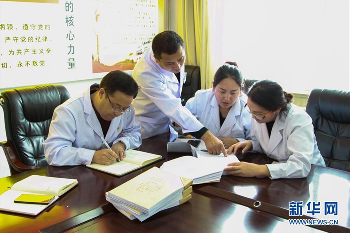 這是來自北京的援青干部劉云軍(左一)和醫(yī)院職工討論工作(資料照片)。新華社發(fā)