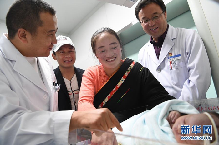 這是來自北京的援青干部劉云軍(右一)看望新生兒(資料照片)。新華社發(fā)