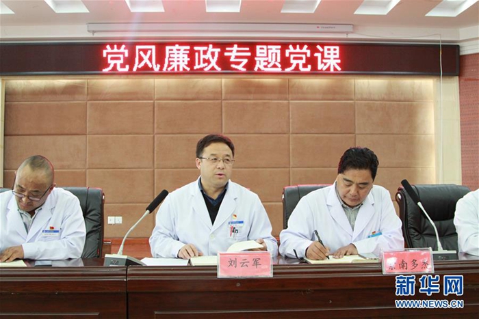 這是來自北京的援青干部劉云軍(中)在黨風(fēng)廉政專題黨課上(資料照片)。新華社發(fā)
