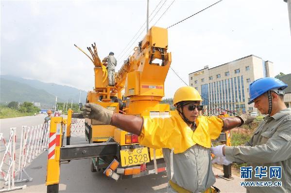 電工胡和鵬(左)穿上絕緣披肩(7月30日攝)。新華社記者 譚元斌 攝