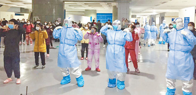 2月12日,武漢國(guó)際會(huì)展中心方艙醫(yī)院,醫(yī)護(hù)人員和患者一起跳舞。程少文攝(影像中國(guó))